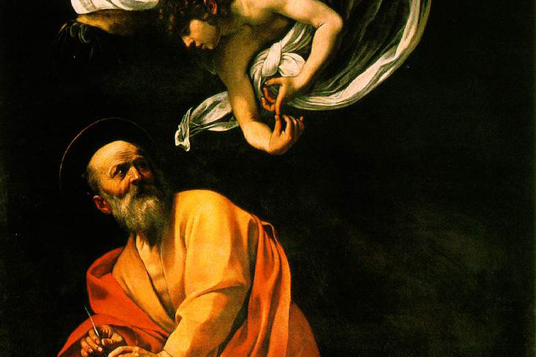 Photo: Caravaggio, “The Inspiration of Saint Matthew,” 1602, oil on canvas, 9’ 8 1/2” x 6’ 2 1/2” (detail)
