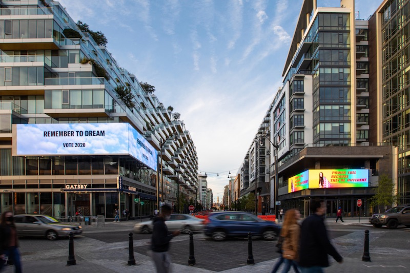 Photo: In Washington, D.C., digital screens project artworks by Carrie Mae Weems and Jeffrey Gibson as part of the “Art for Action” campaign. Photo courtesy Orange Barrel Media