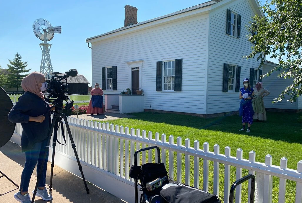 Photo: New York Times journalists Yousur Al-Hlou (L.) and Alexandra Eaton '07 (2nd from R.) set up an interview shot at the Henry Ford, a museum outside Detroit, in August. Photo by Kassie Bracken/New York Times