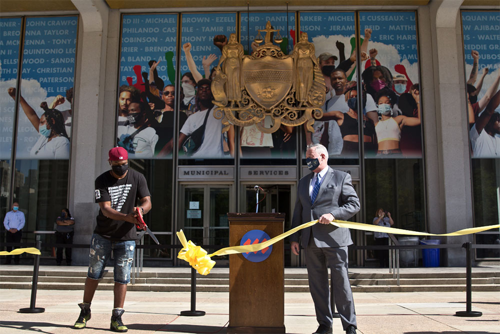 Photo: Artist Russell Craig was joined by Philadelphia Mayor Jim Kenney who held the ribbon at the dedication of Craig’s mural at the city’s Municipal Services Building. (Kimberly Paynter/WHYY)