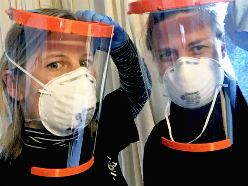 Photo: L–R: Visiting Artist in Residence Maggie Hazen and partner Lauren Enright wearing Bard-made, 3D-printed protective face shields. Photo by Maggie Hazen