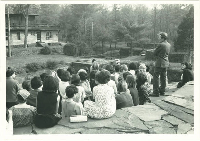 Photo: Fite lectures to a group of Mills College students at Opus 40 in 1965.